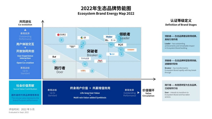 会上发布的“2022年生态品牌势能图”将全球生态品牌分为“践行者”、“突破者”、“领航者”:践行者,有意愿践行为生态品牌,已经有所行动;突破者,生态品牌转型取得突破,进展相对较快;领航者,生态品牌建设取得成果,具有引领作用。